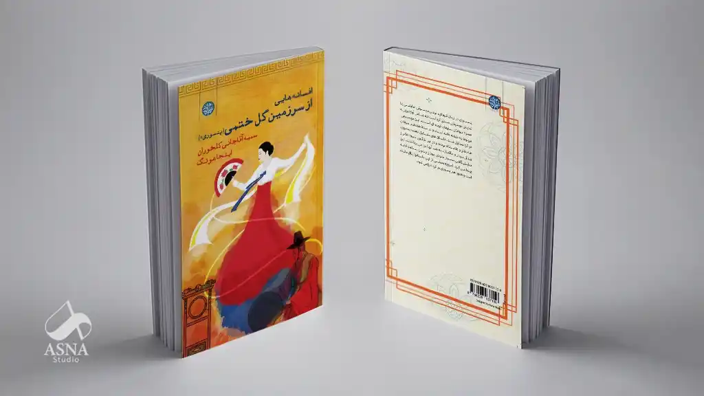 در طراحی جلد کتاب «افسانههای از سرزمین گل ختمی (پنسوری)» تلاش کردیم تا طرح به گونه ای باشد که بلافاصله فضای فرهنگی شرق آسیا را تداعی کند. استفاده از موتیفهای کلاسیک کرهای، نظیر رنگهای پررنگ و شاد، حاشیه مستطیلی با طرحهای سنتی معماری و نقشهای تکرارشونده و ظریف در پسزمینه زرد/نارنجی، همگی نشانههای قراردادی از فرهنگ عامه این منطقه هستند. تصویر مرکزی، زنی را در حال رقص سنتی با لباسهای پرحجم و رنگهای تند (غالباً قرمز و سفید) نشان میدهد که نشانهای شمایلی از یک قصه، اسطوره یا افسانه فولکلوریک است. حرکت پارچهها و حالت بدن، حس روایت، تحرک و درام موجود در افسانهها را القا میکند. حضور یک چهره مبهم مردانه در پسزمینه پایین، که نمادی از شخصیتهای همراه، شریک یا مکمل زن است و در حال نواختن ساز کوبه ای و موسیقی سنتی کره(پنسوری)، به بعد روایی و رابطهای افسانهها اشاره دارد. رنگ زرد/طلایی حاشیه بالا، نماد قدمت، شکوه و ارزش ادبی این افسانههاست.