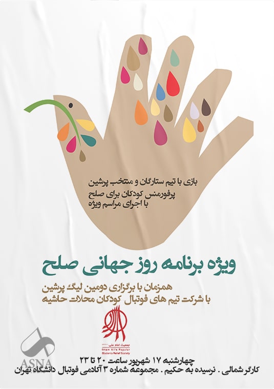 پوستر این همایش به سفارش سازمان مردم نهاد جمعیت امام علی طراحی شده است. این پوستر که به مناسبت روز جهانی صلح طراحی شده از نماد جهانی صلح، کبوتری با یک برگ زیتون الهام گرفته و از سبک تصویرسازی کودکانه استفاده شده چرا که مخاطبان اصلی این برنامه کودکان و نوجوانان هستند. در تصویرسازی کبوتر از فرم دست استفاده شده که نماد همبستگی و تلاش کودکان کار این مجموعه است. همچنین قطرات باران در رنگهای مختلف نشان دهنده فراخوانی برای حمایت همگانی از این سازمان و کودکان است.